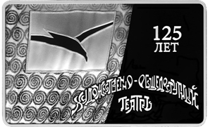 изображение исторического занавеса с фигурой летящей чайки, выполненное в технике лазерного матирования, справа имеются рельефные надписи: вверху в две строки – «125 ЛЕТ», внизу стилизованным шрифтом в две строки – «ХУДОЖЕСТВЕННО-ОБЩЕДОСТУПНЫЙ ТЕАТРЪ».