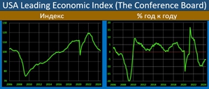Conference Board отмечает, что “… в мае LEI в США снова упал, что обусловлено, главным образом, сокращением количества новых заказов, слабыми потребительскими настроениями в отношении будущих условий ведения бизнеса и снижением количества разрешений на строительство. Хотя шестимесячные темпы роста индекса оставались стабильно отрицательными, LEI в настоящее время не сигнализирует о рецессии. Рост реального ВВП еще больше замедлится до менее 1 процента (в годовом исчислении) во 2 и 3кв24, поскольку повышенная инфляция и высокие процентные ставки продолжают оказывать давление на потребительские расходы…”