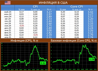 Потребительские цены в США в апреле, согласно статистике BLS месячный CPI с устранением сезонности немного подрос до 0.22% mm sa vs -0.05% в марте (ожидалось: 0.3% mm sa). Годовой показатель сократился до 2.31% гг vs 2.39% (ожидалось: 2.4% гг).