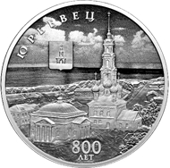 рельефные изображения герба города Юрьевца и вида на Георгиевскую площадь с храмовым комплексом на фоне изображения Волги, выполненного в технике лазерного матирования; рельефные надписи: вверху слева по окружности – «ЮРЬЕВЕЦ», внизу в две строки – «800 ЛЕТ».