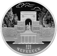 рельефное изображение памятника воинам, погибшим в годы Великой Отечественной войны, со стеной памяти на фоне выполненных в технике лазерного матирования изображений деревьев и облаков; в нижней части монеты на матированном участке – надпись в три строки «200/ЛЕТ/ЧЕРКЕССК».