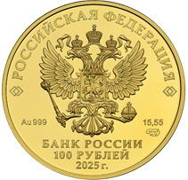 рельефное изображение Государственного герба Российской Федерации, над ним вдоль канта – надпись полукругом «РОССИЙСКАЯ ФЕДЕРАЦИЯ», обрамленная с обеих сторон сдвоенными ромбами, под гербом слева – обозначения драгоценного металла и пробы сплава, справа – содержание химически чистого металла и товарный знак монетного двора, внизу в центре в три строки – надпись «БАНК РОССИИ», номинал монеты «100 РУБЛЕЙ», год выпуска «2025 г.».