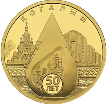 рельефные изображения: в центре – скульптурной композиции «Капля жизни», слева – храма святой мученицы Татианы, справа – городских домов; нижнюю часть монеты пересекает рельефная орнаментальная полоса; надписи: вверху по окружности – «КОГАЛЫМ», внизу в круглой рамке в две строки – «50 ЛЕТ».