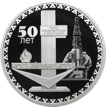 рельефное изображение стелы на фоне выполненного в технологии лазерного матирования изображения буровых работ на фоне буровой установки; вверху слева – рельефная надпись в две строки «50 ЛЕТ»; по окружности – выполненный в технологии лазерного матирования национальный орнамент.