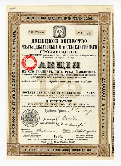 На «пике» экономического роста в Российской империи, в июле 1891 года было организовано «Донецкое общество железоделательного и сталелитейного производства». Как отмечалось в Уставе общества, его целью были «…постройка около станции «Дружковка» Курско-Харьковско-Азовской железной дороги чугуноплавильного, железоделательного и сталелитейного завода с механическою при оном фабрикою… приобретение в эксплуатацию каменноугольных копей, месторождений железных, марганцовых и других руд, залежей известняка, доломита и других огнеупорных материалов…» Предполагалось также заниматься «торговлей означенными материалами, а равно и предметами производства заводов общества».