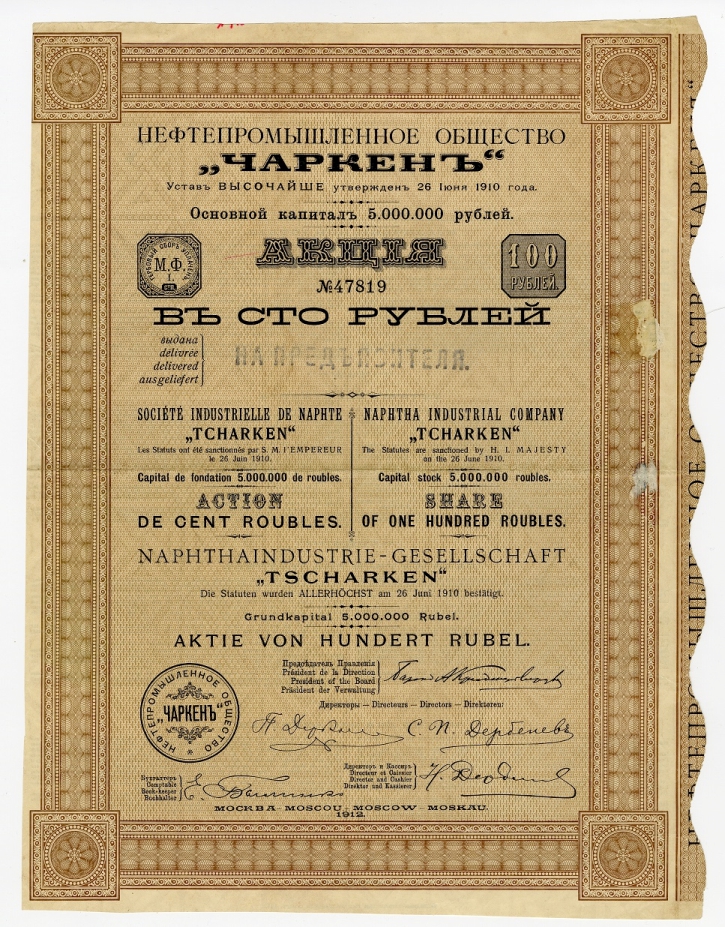 Основной капитал АО «Чаркен» составлял 5 млн. руб. Капитал делился на 50 тысяч акций. Номинальная цена каждой – 100 рублей. По желанию владельца, акции могли быть именными или на предъявителя. Несмотря на ярко выраженный региональный характер работы, ориентированный на Закаспий, правление Общества находилось в Москве. Примечателен состав Общества. В нем числились потомственные почетные граждане отец и сын П. Н. и Н. И. Дербеневы, В. Я. Бурдаков, И. Ф. Шмидт. А возглавлял Правление известный политик и буржуазный практик барон Александр Амандович Крюденер-Струве.