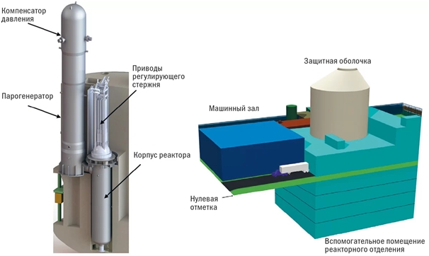 ММР построены вокруг "ядерного острова", основанного на проверенной технологии реакторов с водой под давлением (PWR), с использованием стандартного для отрасли оксида урана (UO2) в качестве топлива. Три центробежных насоса циркулируют теплоноситель к трем соответствующим вертикальным парогенераторам, общая электрическая мощность которых составляет около 470 МВтэ. Конструкция ядерного острова также включает множество активных и пассивных систем безопасности, каждая из которых имеет значительное внутреннее резервирование. Малые модульные реакторы имеют сниженные требования к топливу. Электростанции на основе ММР могут требовать менее частой дозаправки - каждые 3-7 лет, по сравнению с 1-2 годами для традиционных станций. Некоторые ММР рассчитаны на эксплуатацию до 30 лет без дозаправки.
