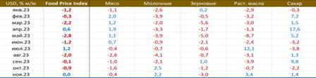 Индекс продовольственных цен ФАО рассчитываемый в USD, в ноябре составил: 0.0% мм / -10.7% гг vs -0.9% мм / -11.1% гг в октябре. Общий индекс несколько подрос, это связано в основном со скачком на растительные масла (пальмовое и подсолнечное) и сахар (снижение прогноза экспорта из Таиланда и Индии)