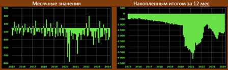 Расходы в марте 2024 года составили $569 млрд, формально -$123 млрд гг, но с поправкой на сезонность: -$49 млрд. Основной фактор: в марте прошлого года было много потрачено на возмещение депозитов нескольких обанкротившихся банков, а также на рефинансирование студенческих ссуд. Доходы в минувшем месяце были на уровне $332 млрд
