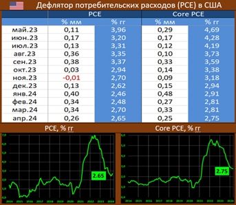Вышедшая статистика BEA показывает, что в апреле динамика PCE составила 0.26% мм/2.65% гг (ранее: 0.34% мм/2.7% гг), ждали 2.7% гг, а базовый индекс: 0.25% мм/2.75% гг (ранее: 0.33% мм/2.81% гг), прогноз: 0.3 мм и 2.8% гг.