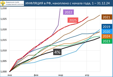 В 1К25 рост ИПЦ - 2.61%. Это сильно выше траектории прошлых лет (за исключением 2022г). Уложиться в прогноз ЦБ (7-8%) будет сложно.